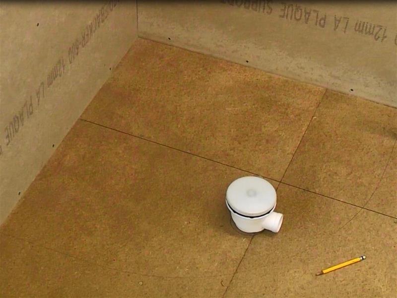 Aquí estamos instalando un plato de ducha cuadrante en un piso de madera. Para comenzar, debe asegurarse de que el área sea adecuada para la instalación de la ducha, por lo que las paredes deben estar hundidas o construidas con tablas de cemento. Coloque la bandeja en la esquina y dibuje alrededor con un lápiz, también dibuje alrededor de la salida de desechos.
