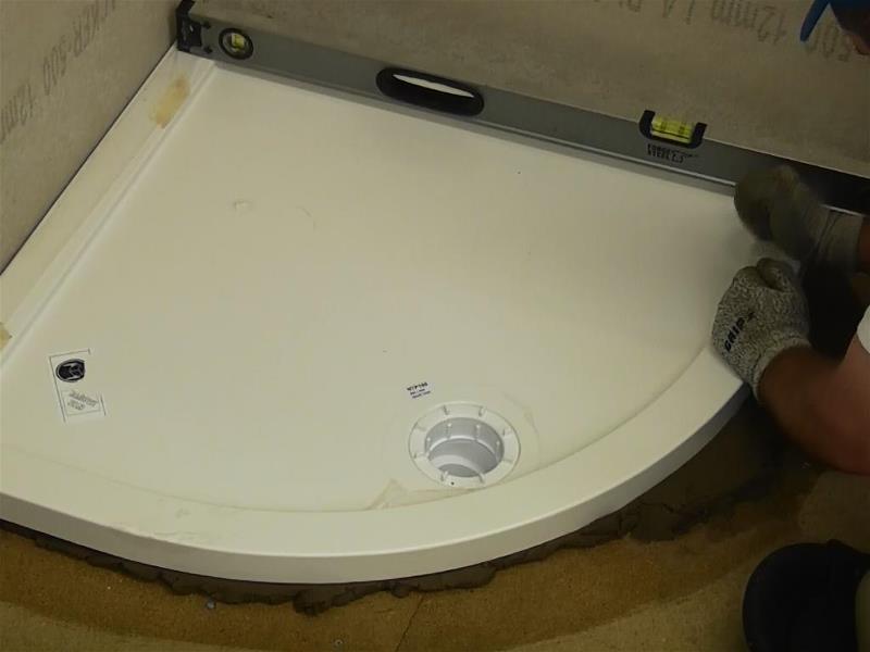 Coloque cuidadosamente la bandeja en el mortero y nivele con un nivel de burbuja, una vez que el mortero se haya endurecido, puede sellar alrededor de los bordes con un sellador de buena calidad. Otra mejor opción es usar una tira de sellado de baño